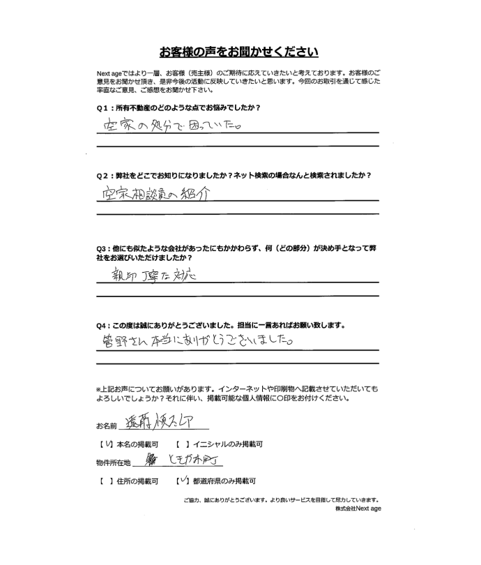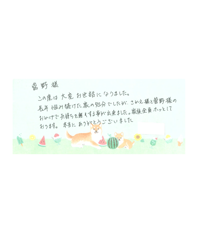 加えて担当の阿部様、菅野様の対応が素晴らしく、細かいサポートもあり、安心して気持ち良く取引させていただきました。ずっと気になっていた空き家が良い条件で処分出来、とても感謝しています。