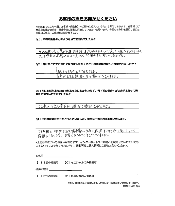 管理がされていない土地にも関わらず、こちらの負担を最小限に抑えた条件でご対応いただき、本当に助かりました。