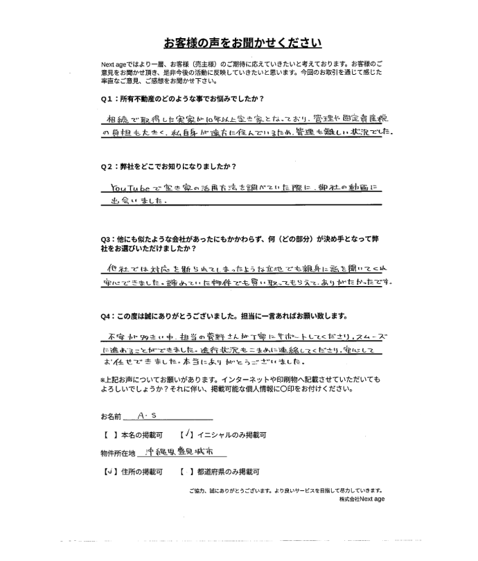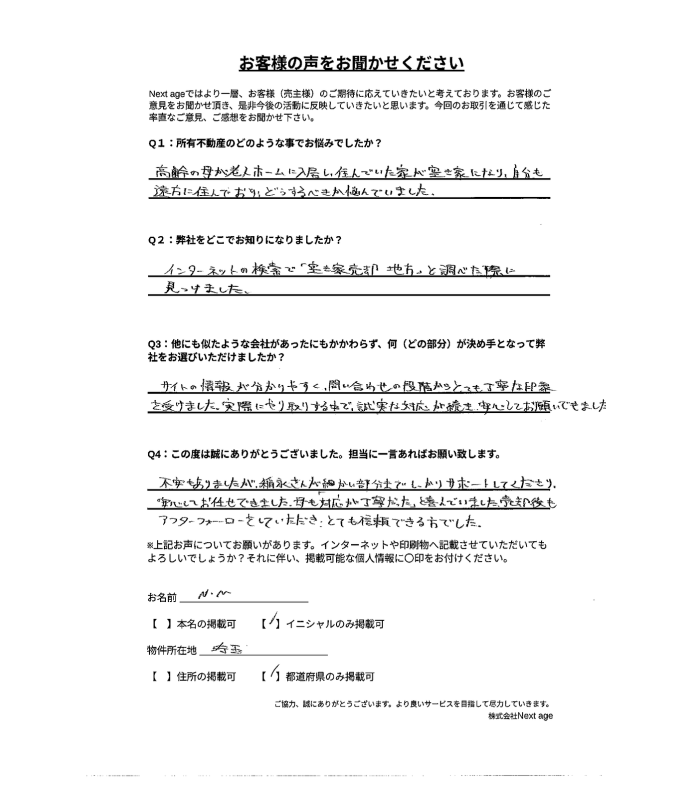 地元の不動産屋さんでは取り扱い不可能な物件でしたが、1ヶ月ちょっとで契約まで終わり、勇気を出して問い合わせをして良かったです。 安心してお任せできる会社だと思います。